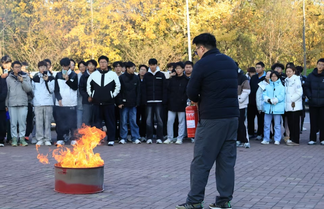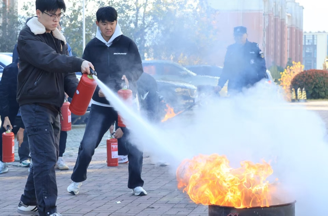 活动伊始,校保卫处张思宇结合校园火灾典型案例,从火灾成因、初期火情识别、逃生路线规划等方面展开讲解,让师生快速掌握基础安全知识。随后,校保卫处工作人员在演练场地打开了发烟罐,模拟“楼道浓烟”场景,参演师生在工作人员引导下弯腰捂鼻,沿墙壁快速有序撤离至指定安全区域。演练尾声,校保卫处工作人员现场演示干粉灭火器“提、拔、握、压”操作要领,师生轮流上手实操,亲手扑灭模拟火源,在实践中掌握灭火技能。