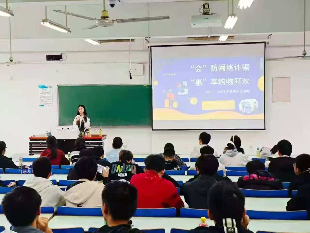 讲座中,白默菡聚焦“双11”期间高发的网购诈骗类型,结合真实案例系统讲解了“虚假客服退款”、“刷单返利”、“中奖信息”等典型骗局,清晰勾勒出各类诈骗的共性特征与隐蔽陷阱。随后在“防诈快问快答”互动环节,白默菡围绕前述诈骗类型、识别技巧、维权途径等核心内容随机提问,同学们纷纷举手应答,回答正确率稳步攀升,现场气氛热烈。